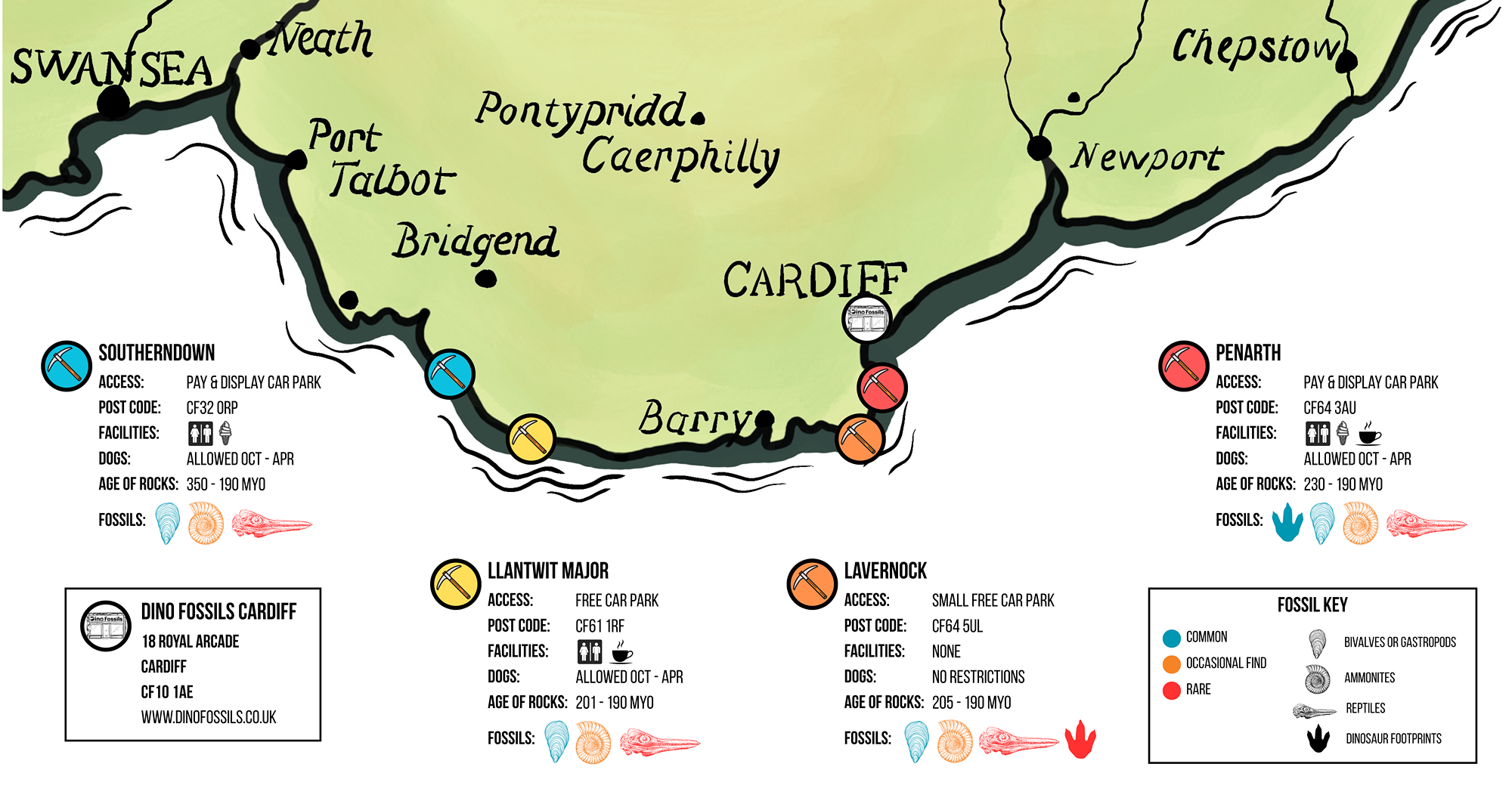 By the Early Jurassic (approximately 201–190 million years ago), the region transformed into a warm, shallow tropical sea, depositing the Blue Lias formation, visible at Southerndown and Penarth, with alternating limestone and shale layers. This environment teemed with marine life, preserving abundant fossils like bivalves (Gryphaea and Plagiostoma), ammonites (Psiloceras and Schlotheimia), and occasional ichthyosaur remains, found among beach pebbles and cliffs. The shift from desert to sea reflects a global transgression, flooding the terrestrial landscape. At Southerndown, the Blue Lias limestones yield bivalves and rare reptile remains, while Penarth’s fossil-rich pebbles highlight the biodiversity of this ancient tropical seascape.