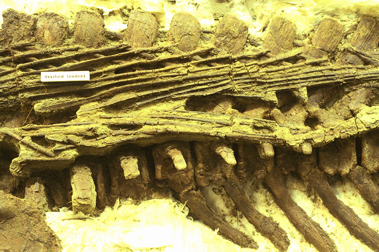 Ossified tendons, a distinctive feature of Edmontosaurus fossils from the Hell Creek Formation (Maastrichtian, Late Cretaceous, ca. 66 million years ago), are mineralised connective tissues that stiffened the dinosaur’s tail and back, aiding in locomotion and stability. Edmontosaurus, a large hadrosaurid dinosaur, roamed the subtropical floodplains of what is now Montana, Wyoming, and the Dakotas, and its ossified tendons are frequently found preserved in the formation’s sandstones and mudstones. These tendons, forming a lattice-like structure along the vertebral column, were composed of collagen in life but became mineralized during fossilization, preserving as hard, bony rods. Their presence, particularly around the tail, suggests Edmontosaurus relied on a rigid, flexible tail for balance while moving bipedally or foraging as a facultative biped in lush, riverine environments alongside other dinosaurs like Tyrannosaurus.